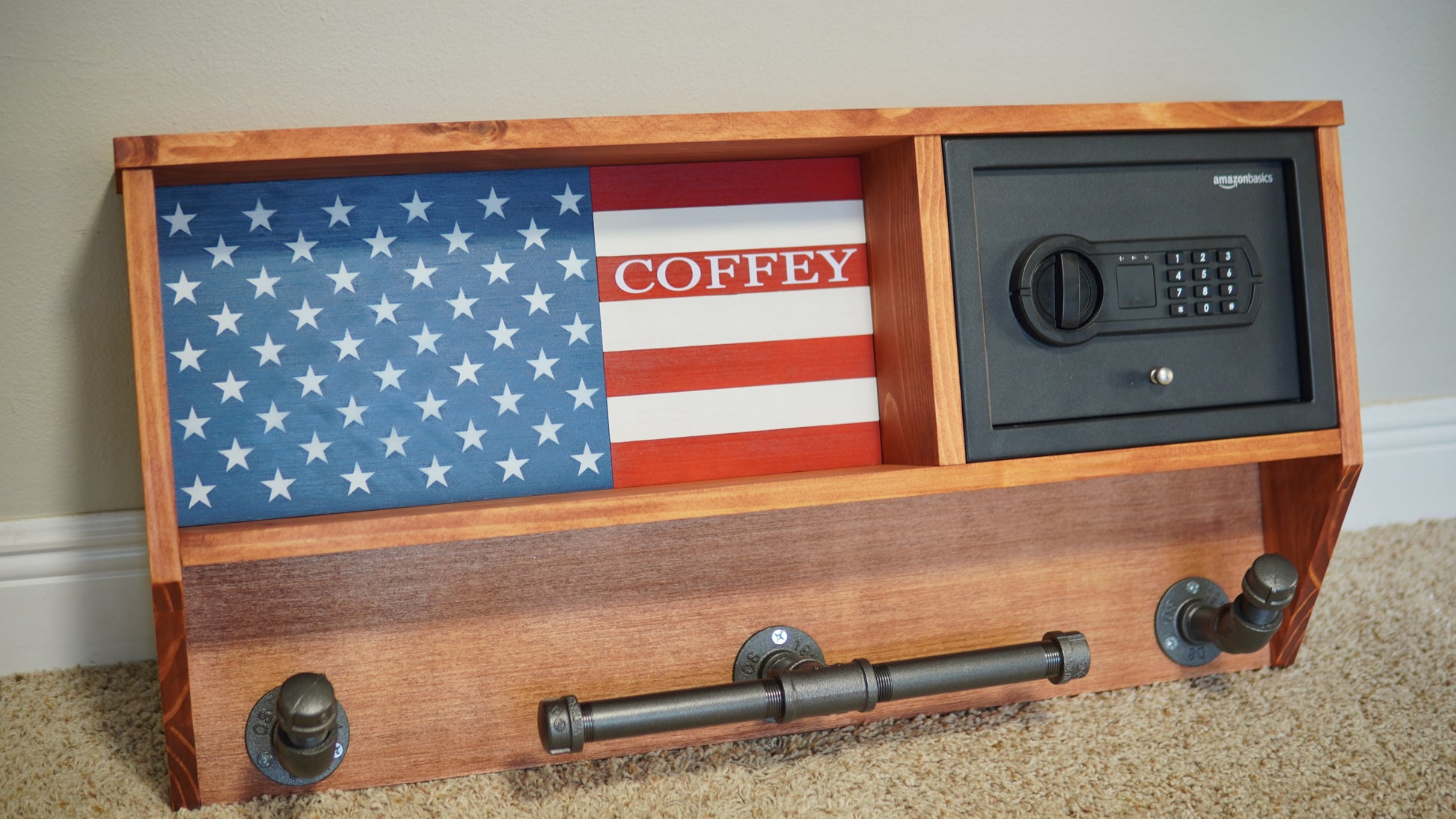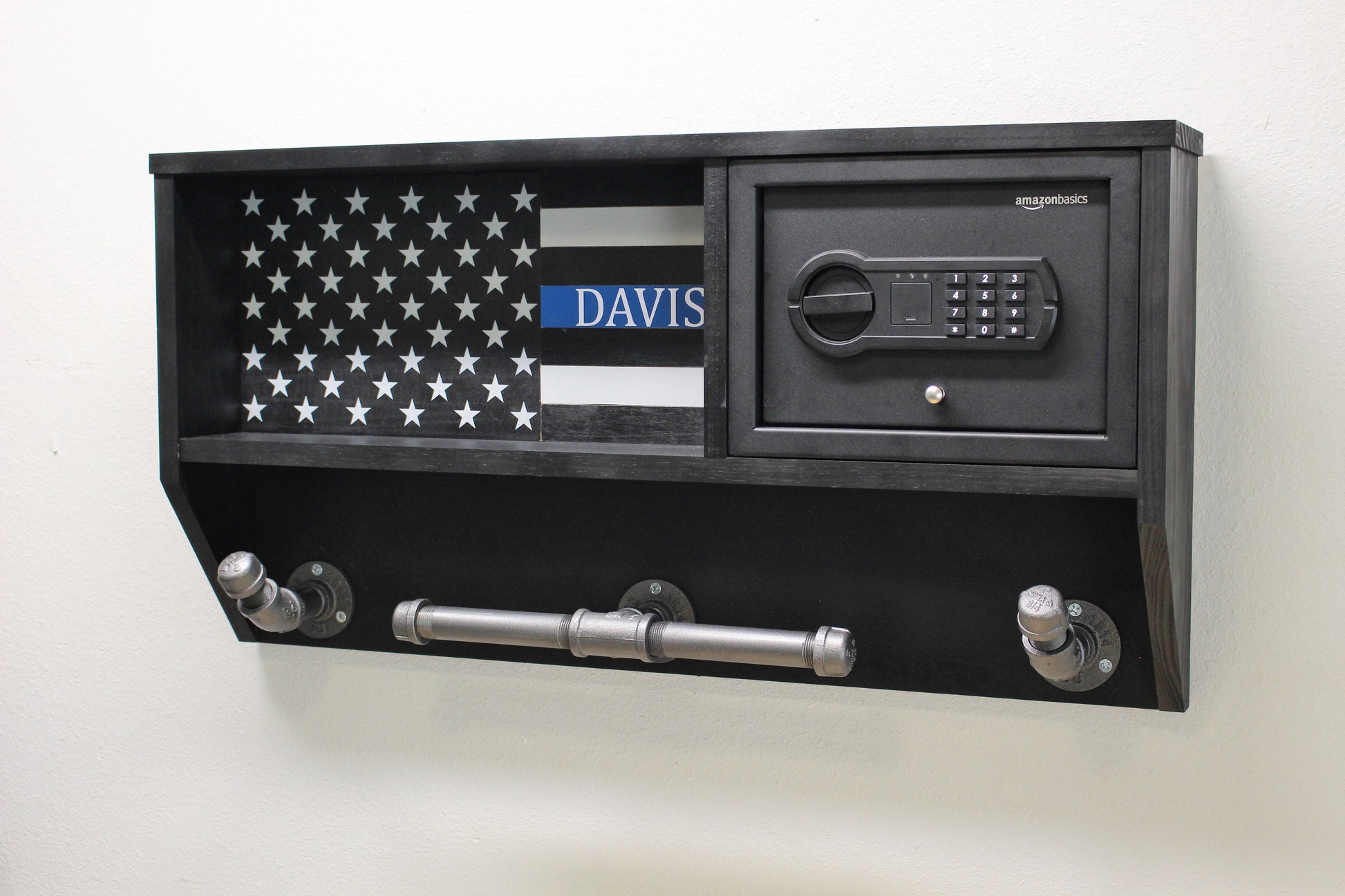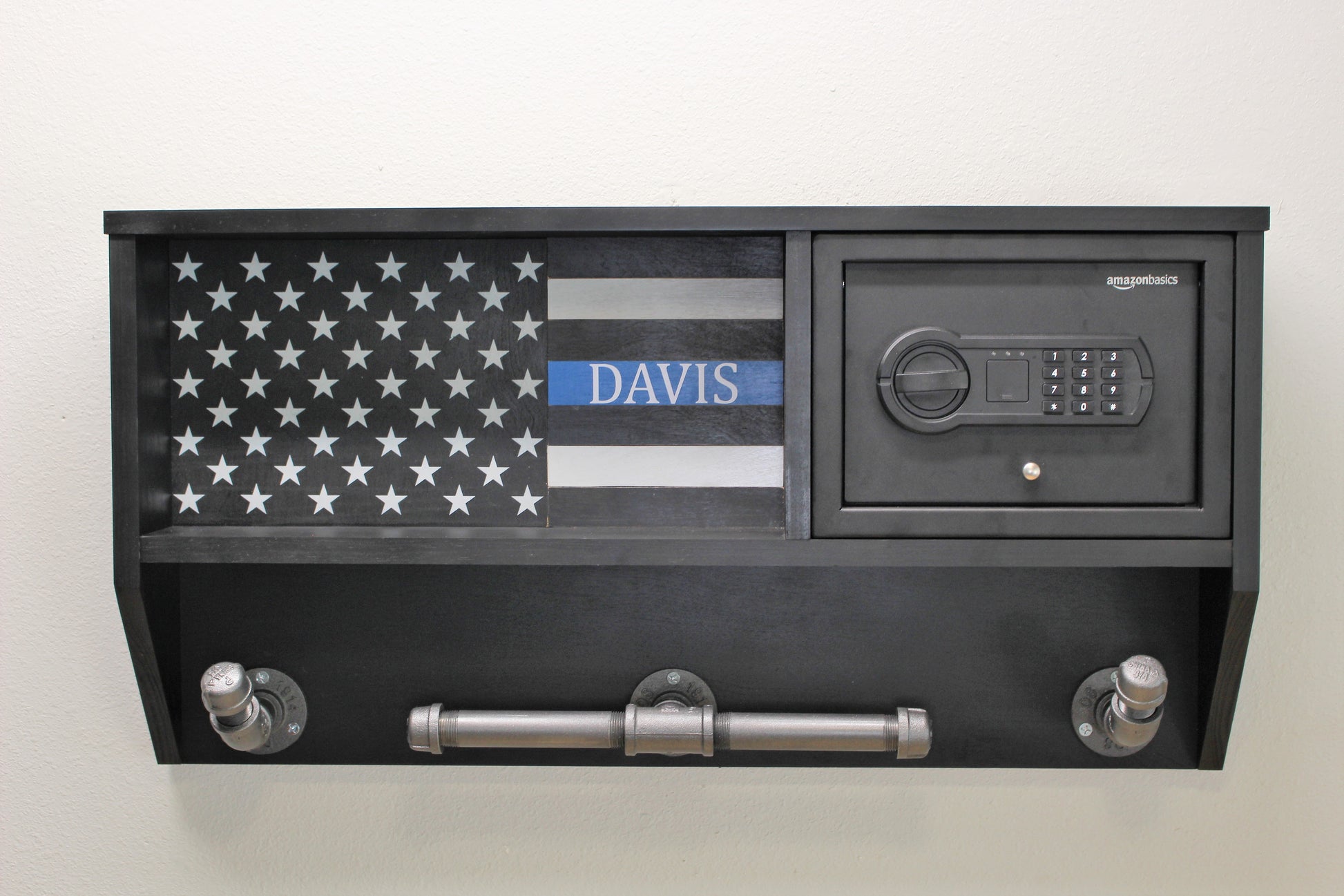 Display and store your duty gear with pride with this stylish vest holder that keeps your gear organized, secure, and out of the way. This rack is made from top quality materials and a personalized thin blue line flag that will accent any space in your home.